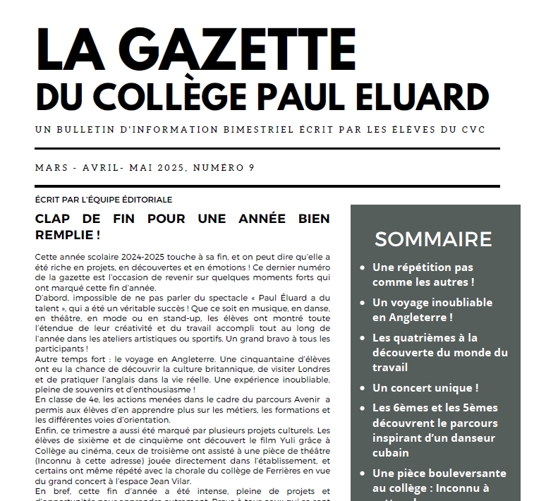 Neuvième numéro de la Gazette du Collège Paul Eluard ! août 21, 2025août 21, 2025 admin_eluard45 Découvrez le neuvième numéro de la Gazette du Collège Paul Eluard ! 📰 Pour la lecture, c’est ici : Numéro 9 de la Gazette Partager : Cliquer pour partager sur X(ouvre dans une nouvelle fenêtre) X Cliquez pour partager sur Facebook(ouvre dans une nouvelle fenêtre) Facebook Cliquez pour partager sur WhatsApp(ouvre dans une nouvelle fenêtre) WhatsApp Articles similaires